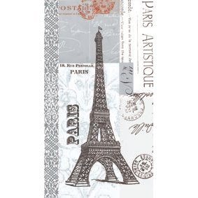 This guest towel/buffet size napkin will be perfect for your French themed event! The collage format of Paula Scaletta's artwork surrounds this napkin with the Eiffel Tower, French addresses, and French postmarks. The neutral color will work with any party decor! Package contains 15 3-ply napkins, 4 1/2" x 8" folded. Design is on all panels.