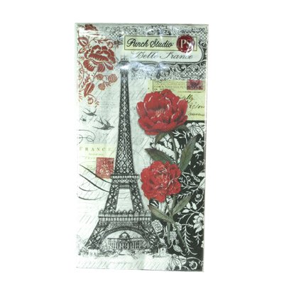 This gorgeous napkin will add style and sophistication to your next party. The French-themed, collage design highlights the Eiffel Tower. The red flowers area a bold and dramatic contrast to the black & white background. The design is on all panels. There are 16, 3-ply, high-quality paper guest towel size napkins in each package. Impress your hostess, or your guests, with this stunning napkin. (8 1/4" x 4 1/4" folded) Price is for 1 package of the guest towel size. (The photo of 3 shows other sizes and the variation of the design)Read more Napkin/Guest Towel - Belle France - By Punch Studio - Collage, Eiffel Tower Design